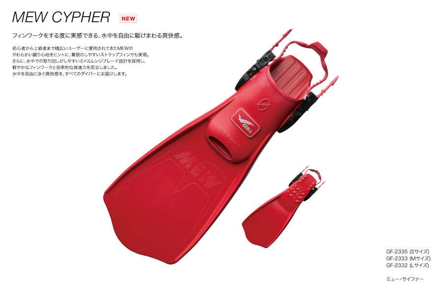 定評のあるSUPERMEWをストラップフィンタイプにし、さらに運動性能もグレードアップ。あらゆるダイバーが快適に使用できるよにあえて全長・ブレード長を短くすることで、取り回しが容易になりながらもスーパーミュー同様、抜群の推進力を発揮します。ウエットスーツ、ドライスーツどちらもご使用いただけます。