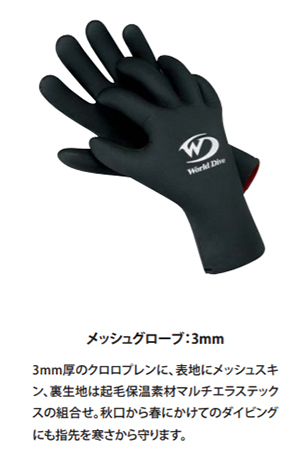 3ミリ厚のクロロプレンに、表地メッシュスキン、裏生地は起毛保温素材マルチエラステックスの組み合わせ、秋口から春にかけてのダイビングにも指先を寒さから守ります。
