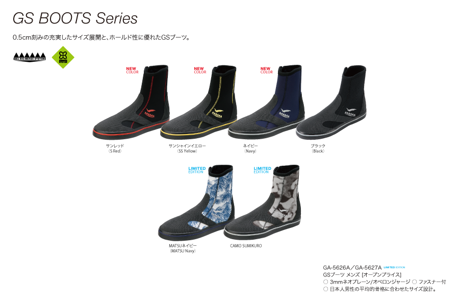 0.5㎝刻みの充実したサイズ展開と、ホールド性に優れたGSブーツ。